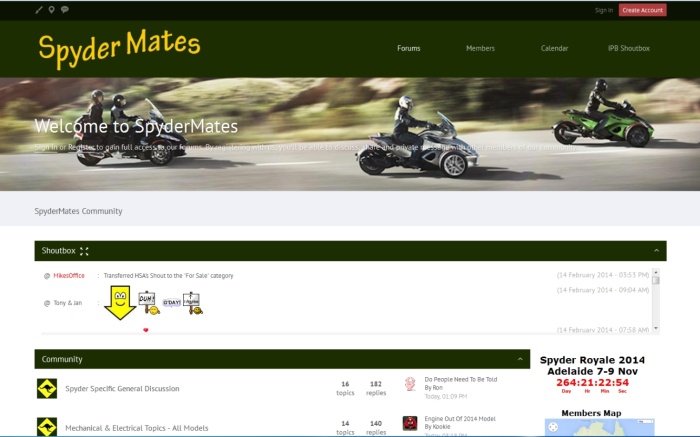 SpyderMates is an Australian Spyder Forum, an Australian motorcycle Forum dedicated to the Spyder - a 3 wheel motorcycle thats fun! Everybody welcome. Share your Can Am Spyder passion.